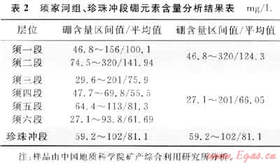 Couch[13]認為,沉積物中的硼(B)含量多少與水體鹽度有關,即水體鹽度越高,硼含量就越大,沉積物吸附的硼離子就越多,故硼可以作為指示古水體鹽度的主要標志。據(jù)Walker等(1963)研究認為黏土礦物中硼含量大于120mg/L為咸水;80~120mg/L為半咸水;小于80mg/L的為淡水。筆者近期對大川中及九龍山地區(qū)須家河組、侏羅系珍珠沖段地層采樣進行了微量元素分析,結(jié)果如表2所示。
