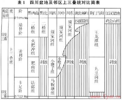 發(fā)生在三疊紀中晚期的印支二幕運動,結(jié)束了揚子地臺漫長的海相沉積歷史,在上揚子地區(qū)的晚三疊世形成了從殘留海相地層到陸相地層的地層沉積序列。以現(xiàn)今的四川盆地為代表,晚三疊世地層為一套西厚東薄、北薄的楔狀體。川西地區(qū)上三疊統(tǒng)包括海相-海陸過渡相的馬鞍塘組(垮洪洞組)、小塘子組(現(xiàn)已合稱為須一段)及須家河組(對應須二段及其以上地層),地層厚逾4000m。川中地區(qū)上=疊統(tǒng)厚500~600m。新近完鉆的立18井須一段巖心中見石英砂巖,并在頁巖中發(fā)現(xiàn)海相雙殼類化石,更證實了須瀝積期的殘余海灣已延伸至川中地區(qū)。經(jīng)川東到鄂西醛秭歸上三疊統(tǒng)變薄相變?yōu)楹穸葍H數(shù)十米的“沙溪鎮(zhèn)”組粗碎屑沉積。經(jīng)川南到貴州西部、北部大部分地區(qū)也變薄相變?yōu)閿?shù)十米至不足200m厚的“二橋組”粗碎屑河流相砂巖沉積(表1)。