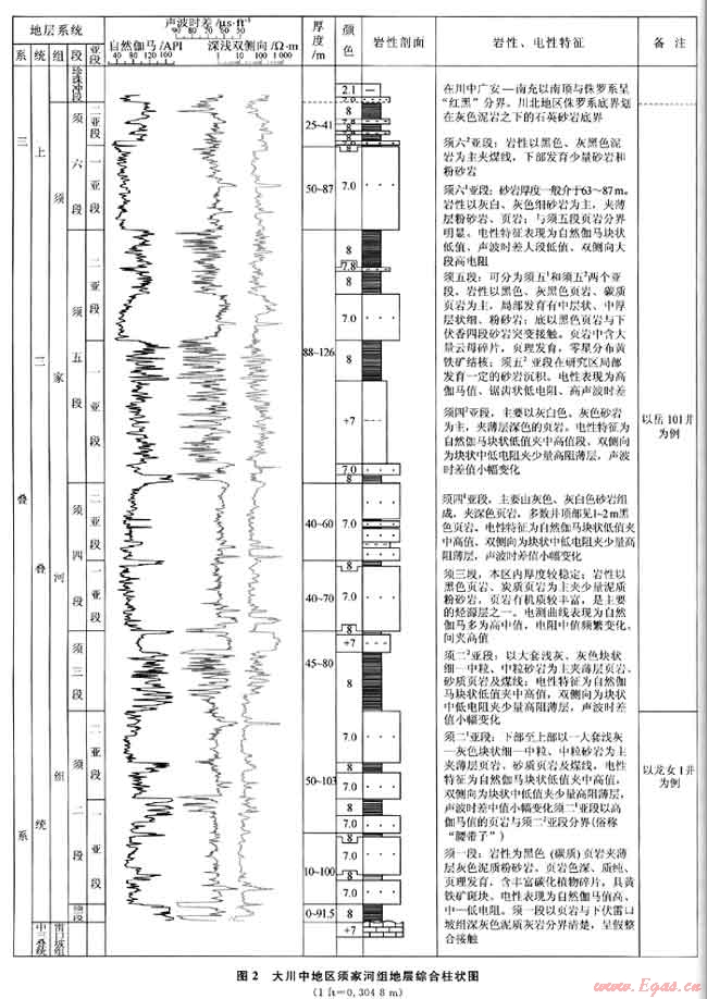 本文所指的四川盆地大川中地區(qū)地理位置北至營山-鹽亭一線,西達威遠-八角場,南抵大足-威遠,東接華鎣山,面積達4×104km2(圖1)。該研究區(qū)是近年來四川盆地天然氣勘探開發(fā)的重要區(qū)域之一。大川中地區(qū)上三疊統(tǒng)須家河組地層縱向上可劃分為須一段-須六段6個巖性段,其中須一、須三、須五段巖性以泥頁巖夾煤層為主,須二、須四、須六段則為砂巖夾泥頁巖(煤)。侏羅系底界劃分意見:在川中南部地區(qū)以“紅黑”原則將侏羅系底界劃在紅色泥巖之下出現(xiàn)的砂巖底界;而川北地區(qū)如龍崗、八角場地區(qū)則劃在灰色泥巖之下的石英砂巖底界。其中須二、須四段基本上以其中部的泥巖段(須二段中部泥巖段,現(xiàn)場稱為“腰帶子”)又劃分為2個亞段,須六段也按巖性劃分出2個亞段(圖2)。