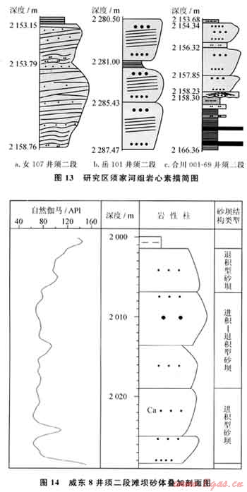 具正粒序的砂體,自然伽馬測井曲線常呈鐘形,往往被解釋為河流砂體,這是導致須家河組解釋為三角洲相的一個基本因素。經(jīng)巖心觀察及微觀研究,具鐘形形態(tài)的砂體除河流體外,另外是風暴巖砂體和退積式砂壩(可能類似于羅啟后教授稱的水進河床砂)。退積式砂壩系指當湖平面上升速度大于灘壩砂體加積速度時,灘壩砂體退積式沉積,其上部最終演化成湖盆細粒沉積物的粉砂坪或泥坪,亦可稱之為等效湖進灘壩。與這種退積式灘壩伴生的下部地層多為進積式的灘壩疊加體,而向上為較深水的泥巖(圖14)。