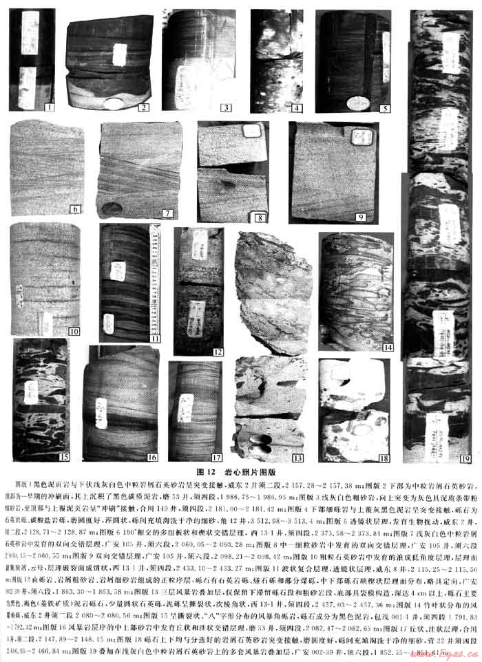 須家河組地層中發(fā)育多種類型的沉積構(gòu)造。泥頁巖、粉砂巖中常見生物擾動構(gòu)造(圖12-5)、浪成沙紋構(gòu)造、透鏡狀層理;砂巖中除常見的板狀斜層理外,在許多井巖心中可頻見雙向交錯層理(圖12-6~9)、浪成低角度層理(俗稱“酥餅狀構(gòu)造”)(圖12-10),亦可見波狀復合層理(圖12-11)。特別是在位于目前許多學者劃分為三角洲平原相區(qū)的營山、廣安、河包場地區(qū)須四、須六段巖心中均有出現(xiàn)。雙向交錯層理可在濱淺湖(海)環(huán)境的濱岸席狀砂和障壁砂壩由不同方向的波浪作用形成,也可在三角洲前緣河口壩中出現(xiàn),但后者不可能頻繁出現(xiàn)。波狀復合層理、透鏡狀層理不僅在潮汐環(huán)境中發(fā)育,在三角洲前緣、淺水陸棚中亦可出現(xiàn)[16]。