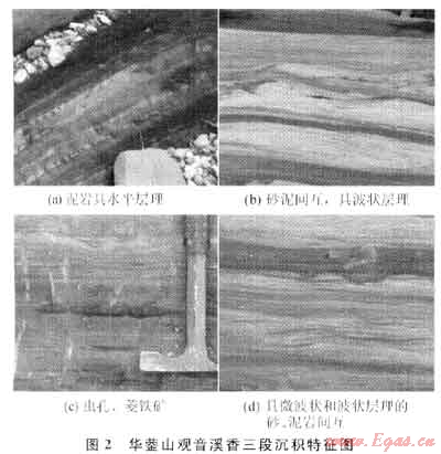 上述特征即使在可能鄰近湖泊邊緣的華鎣山觀音溪露頭剖面上也表現(xiàn)得很清楚。該剖面中的巖層被溪水沖刷得非常干凈,沉積特征十分清楚,香三、香五段以灰黑色泥頁(yè)巖為主,夾薄層灰色、灰質(zhì)細(xì)-粉粒砂巖。泥頁(yè)巖中水平和微波狀層理非常發(fā)育,其中時(shí)夾菱鐵礦條帶或菱鐵礦結(jié)核薄層,上部局部含豐富炭質(zhì)甚至成煤線;粉砂巖具有發(fā)育的波狀層理和豐富的蟲孔,普遍含灰質(zhì),局部成泥灰?guī)r團(tuán)塊或條帶,也夾有菱鐵礦條帶或串珠狀結(jié)核薄層(圖2)。