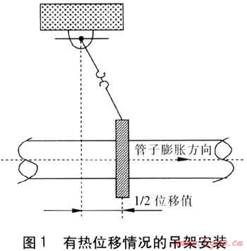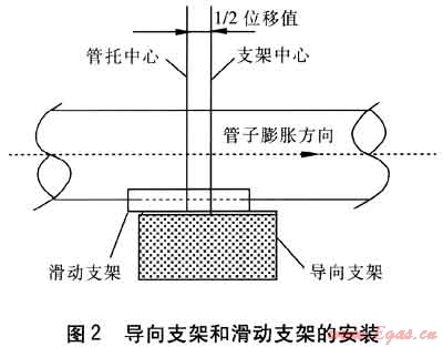 ⑥ 管道波紋管補(bǔ)償器在安裝前要按照使用說明進(jìn)行預(yù)拉伸,安裝方向要與氣流流動(dòng)方向一致且水平安裝。安裝波紋管補(bǔ)償器時(shí),應(yīng)設(shè)臨時(shí)約束裝置,待管道安裝固定后再拆除臨時(shí)約束裝置。管道安裝時(shí),應(yīng)及時(shí)固定和調(diào)整支、吊架。支、吊架位置應(yīng)準(zhǔn)確,安裝應(yīng)平整牢固,與管道接觸應(yīng)緊密。有熱位移的管道,吊點(diǎn)應(yīng)設(shè)在位移的相反方向,按位移值的1/2偏位安裝(見圖1)。固定支架應(yīng)按設(shè)計(jì)文件要求安裝,并應(yīng)在補(bǔ)償器預(yù)拉伸之前固定。導(dǎo)向支架或滑動(dòng)支架的滑動(dòng)面應(yīng)潔凈平整,不得有歪斜和卡澀現(xiàn)象。導(dǎo)向支架和滑動(dòng)支架的安裝位置應(yīng)從支承面中心向位移反方向偏移,偏移量應(yīng)為位移值的1/2(見圖2)。