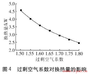 過(guò)??諝庀禂?shù)改變會(huì)影響煙氣進(jìn)口溫度[2],也會(huì)引起煙氣流量變化,使煙氣側(cè)換熱效果發(fā)生變化[3]。保持其他參數(shù)不變,過(guò)??諝庀禂?shù)從1.5增至1.8。根據(jù)燃燒后煙氣總焓不變的原則,計(jì)算出不同過(guò)??諝庀禂?shù)下的煙氣溫度和煙氣流量,代入單管模型進(jìn)行計(jì)算,計(jì)算的換熱量見(jiàn)圖4。過(guò)??諝庀禂?shù)每下降0.1,換熱量可增大20%左右。過(guò)??諝庀禂?shù)增大時(shí),煙氣流量雖然增加,但因燃燒溫度降低使煙氣流速減小,hf減小,使傳熱量減小。故應(yīng)在保證污染物排放不超標(biāo)的前提下,盡量減小過(guò)??諝庀禂?shù)。