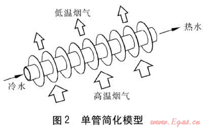 為簡(jiǎn)化,將換熱器中嵌布的水管視作末端絕熱的肋片管,水管由若干(5或6)根肋片管依次串聯(lián)而成,肋片視作直管上的等截面環(huán)肋。高溫?zé)煔鈾M掠肋片管,將熱量傳遞給水管中流動(dòng)的冷水。單管簡(jiǎn)化模型見(jiàn)圖2。在相同的燃?xì)夂牧亢退髁肯?,水?cè)溫升較大,則認(rèn)為換熱效率較高,故可用出口水溫來(lái)衡量肋片管的換熱效率。本研究中比定壓熱容均取相應(yīng)溫度范圍內(nèi)的平均值。