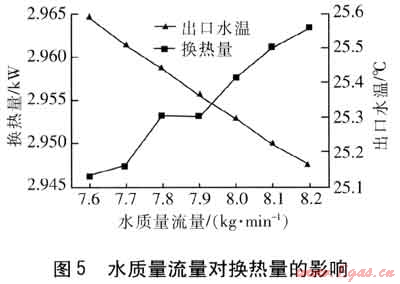 水質(zhì)量流量變化會(huì)引起水的流速變化,影響水側(cè)的傳熱系數(shù),也影響水與煙氣的換熱時(shí)間[4]。保持其他參數(shù)不變,水質(zhì)量流量從7.6kg/min變化到8.2kg/min,換熱量與出口水溫的變化見(jiàn)圖5。由圖5可知,水質(zhì)量流量增大,雖然出水溫度有所下降,但總的換熱量是增加的,換熱器換熱效率提高??梢钥紤]調(diào)節(jié)燃?xì)饬髁颗c調(diào)節(jié)水質(zhì)量流量相結(jié)合來(lái)進(jìn)行燃?xì)鉄崴鞯乃疁乜刂?,提升水溫小幅變化時(shí)熱水器的換熱效率。