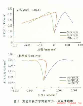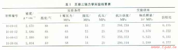 實驗利用MTS815型巖石力學(xué)試驗儀,選取M組不含天然層理面、天然裂縫的基質(zhì)巖心,采取垂直或平行層理面2種方式取樣。巖樣加工成直徑為2.54cm,長度為5.50 cm的柱狀巖心,端面磨平,模擬儲層溫度、壓力條件,進行三軸、單軸力學(xué)實驗;巖樣加工成直徑為3.80 cm,長度為l.O0 cm的柱狀巖心,端面磨平,進行巴西力學(xué)實驗。