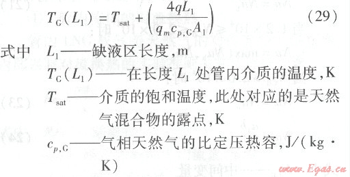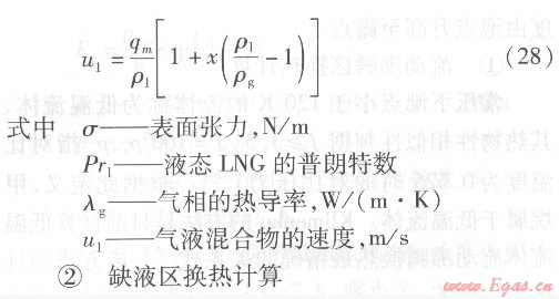 由于LNG是多元組分混合物,而混合物的沸騰換熱很復(fù)雜,因而是較難處理的,目前對二元混合物有一些沸騰傳熱系數(shù)的計算公式,但其中均含有與特定二元物質(zhì)組合有關(guān)的實驗系數(shù),其流動換熱關(guān)系式不能直接應(yīng)用于本課題的LNG介質(zhì)。因此,本文在進行兩相區(qū)的換熱計算時,采用簡化假設(shè)。由于LNG中甲烷的摩爾分數(shù)高達90%以上,故將此區(qū)的LNG看作甲烷。將兩相區(qū)分為流動沸騰區(qū)和缺液區(qū),在流動沸騰區(qū)溫度保持泡點不變,在缺液區(qū)溫度由泡點升高至露點。
