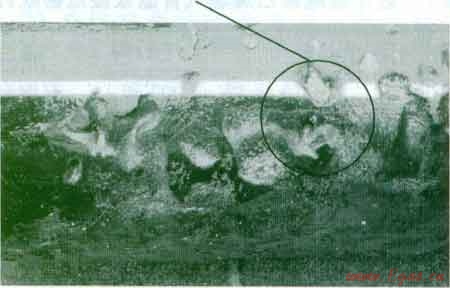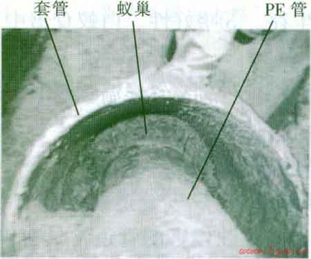 2012年4月,我公司接報(bào)坪山某路段有燃?xì)庑孤?。?jīng)現(xiàn)場(chǎng)檢測(cè)確認(rèn)泄漏部位后,進(jìn)行開挖探查。該段為聚乙烯管道,緊鄰路燈,隨橋跨河敷設(shè),埋深約80 crn,且周邊土壤較為潮濕,管道外加鋼質(zhì)套管保護(hù)。開挖后發(fā)現(xiàn)PE管道與鋼質(zhì)套管的間隙被白蟻蟻巢填滿(見圖l)。經(jīng)現(xiàn)場(chǎng)清理后發(fā)現(xiàn)該段PE燃?xì)夤艿朗馨紫佒g大面積破壞,并確認(rèn)燃?xì)庾园紫佒g破壞穿孔處泄漏(見圖2)。