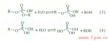 有機酯的水解反應(yīng)為?;忌系挠H核取代,羧酸酯水解反應(yīng)方程式為式(1)[11],產(chǎn)物為羧酸和飽和醇;磷酸酯水解反應(yīng)方程式為式(2)~(4),產(chǎn)物為磷酸和飽和醇。可見,有機酯水解后產(chǎn)物為有機酸和醇類物質(zhì)。由于有機酸為酸化常用體系,有助于酸化,同時醇類物質(zhì)具有較好的潤濕延展性,能降低表面張力。因此,有機酯不僅不會對儲層造成傷害,其水解產(chǎn)物有機酸還能起到一定的酸化效果,醇類還能解除水鎖現(xiàn)象。