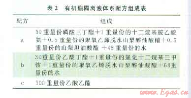 根據(jù)有機酯隔離液體系的組成,設(shè)計了3種具體的配方(表2),開展了配伍性和隔離效果評價。