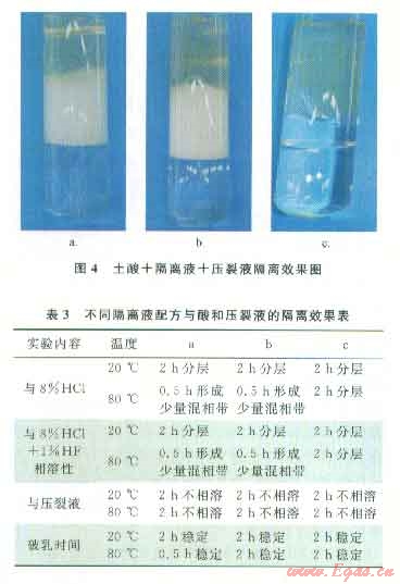 將各隔離液配方分別與酸和壓裂液混合,在低溫(20℃)和高溫(80℃)情況下靜置觀察,其結(jié)果表明有機酯隔離液能有效隔離前置酸和壓裂液(圖4和表3)。
