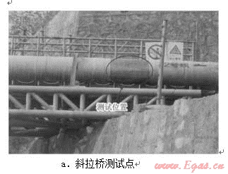 在中國(guó)石化中原油田分公司普光氣田公司(以下簡(jiǎn)稱普光氣田)的協(xié)助下,根據(jù)測(cè)試位置的要求,最終選取了斜拉橋和桁架處作為管道積液測(cè)試位置(圖5)。