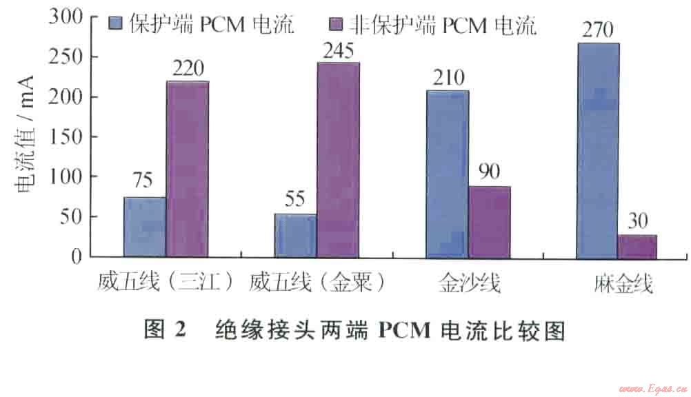 采用RD PCM埋地管線外防腐層檢測儀測試絕緣接頭的漏電比率。將RD PCM儀器的發(fā)射機架設(shè)在絕緣接頭保護端,輸送300mA的PCM電流,利用接收機檢測出有很大部分PCM電流經(jīng)絕緣接頭流人非保護端(如圖2中威五線(金粟)絕緣接頭兩端的PCM電流顯示絕大部分PCM電流流入了非保護一端的站場)。