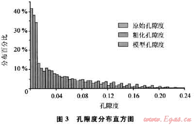 2) 統(tǒng)計(jì)特征對(duì)比。對(duì)比建立的孔隙度、滲透率、含氣飽和度等儲(chǔ)層參數(shù)的模型統(tǒng)計(jì)特征和輸入的原始測(cè)井解釋數(shù)據(jù)及其粗化后的數(shù)據(jù)(圖3),可以看出地質(zhì)模型儲(chǔ)層參數(shù)與原始數(shù)據(jù)的統(tǒng)計(jì)分布特征基本一致。