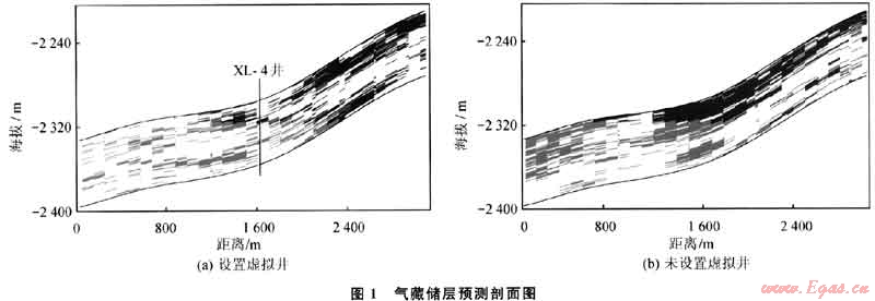 研究結(jié)果表明,根據(jù)地震資料結(jié)合鉆井及地質(zhì)綜合研究構(gòu)建合理“虛擬井”可以有效地解決氣藏邊部井網(wǎng)稀疏區(qū)域井間隨機(jī)性強(qiáng)的缺點(diǎn),能夠進(jìn)一步提高儲(chǔ)層地質(zhì)模型的精度。將采用和不采用“虛擬井”技術(shù)建立的儲(chǔ)層分布模型進(jìn)行對(duì)比可以看出,其儲(chǔ)層的發(fā)育程度和在空間上出現(xiàn)的位置具有很大的不同(圖1),表明僅依靠地震儲(chǔ)層反演成果約束建立的地質(zhì)模型在邊部井網(wǎng)稀疏的地方不能反映薄儲(chǔ)層在縱橫向上分布的特征。