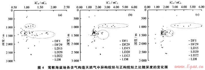 同水溶相天然氣“甲烷化”的原理一樣,由于異構烷烴的溶解度大于正構烷烴[6],水溶氣出溶后異構烷與正構烷的比值增加。從研究區(qū)煤系熱成因氣樣品異構烷烴與正構烷烴比值隨深度的變化規(guī)律可以看出(圖4):隨著深度的變淺,iC4/nC4、iC5/nC5和iC6/nC6都具有較明顯地增加趨勢,在1500~2000m深度處若干比值出現(xiàn)異常的增大。結合本區(qū)實際地質情況,在1500~2000m深度正是本區(qū)由超壓帶向常壓帶過渡的區(qū)域,因此認為由于在該深度溫度、壓力的急劇降低導致天然氣在水中的溶解度降低,水溶相天然氣達到過飽和而出溶,從而使得出溶的天然氣異構烷烴異常富集。