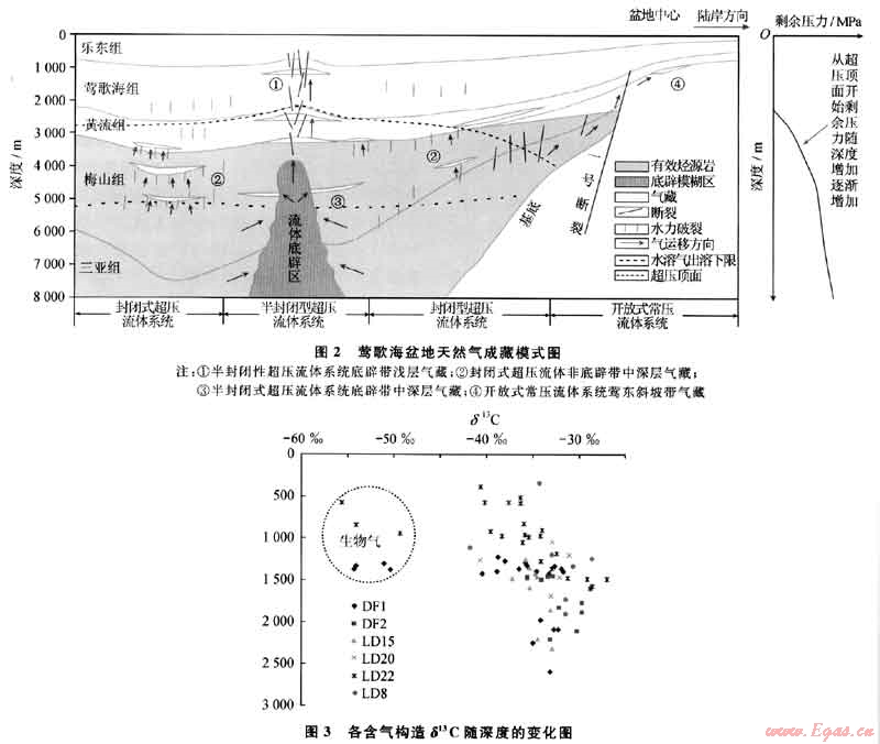 在中中新世以泥底辟為主的演化階段,地層超壓是盆地區(qū)域上壓實不均衡和三亞組大量生烴所導致,天然氣的有利充注部位為位于壓力過渡帶和常壓帶的中中新世背斜構造。在晚中新世-第四紀以熱流體底辟為主的演化階段,盆地超壓體系的形成是不均衡壓實、三亞組生成的無機C02以及梅山組大量生烴所導致,天然氣的有利充注部位為位于壓力過渡帶和常壓帶的上新世鶯歌海組背斜構造。