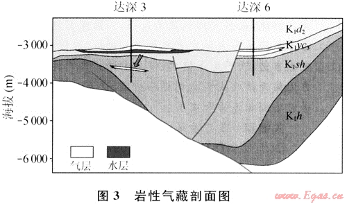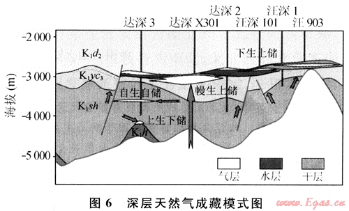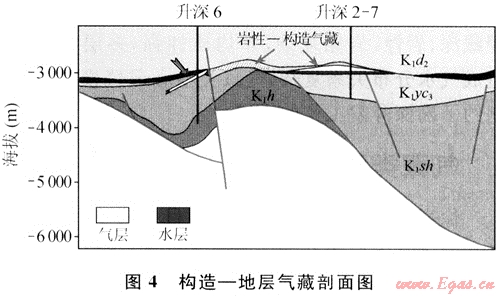 這種氣藏是在構(gòu)造背景下,由于地層發(fā)生尖滅或被剝蝕后,上部致密地層超覆形成天然氣藏,通??煞譃槲挥诘貙硬徽厦嬉陨虾筒徽厦嬉韵聝煞N。這種氣藏類型主要發(fā)育在徐家圍子斷陷地層被剝蝕地區(qū),在目前已鉆探井中,僅有升深6井(沙河子組砂礫巖)揭示為這種氣藏類型(圖4)。該氣藏位于兩個向斜之間的構(gòu)造高部位上,發(fā)育在營四段與沙河子組形成削蝕不整合面以下的沙河子組圈閉中。