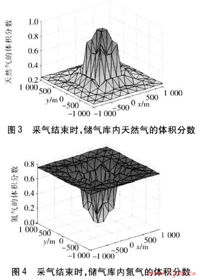 注氣結束后,關井穩(wěn)定20d,以使儲氣庫內(nèi)各點的壓力基本達到平衡狀態(tài),穩(wěn)定之后進行回采。由于氣體相互擴散,兩種氣體的混合帶逐漸變寬,隨著注采井壓力的下降,水會逐漸侵入。運行到第184天時,注采井的含水飽和度超過0.5,認為對回采不利,此時停止采氣,儲氣庫內(nèi)天然氣及氮氣的體積分數(shù)見圖3、4。