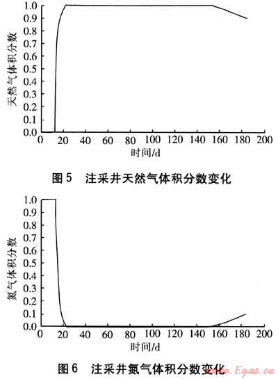 圖5、6為儲氣庫運行過程中注采井天然氣及氮氣體積分數(shù)變化情況。最初12d為注入氮氣階段,天然氣的濃度為0。第13天開始注入天然氣,由于氣體擴散,注采井處的天然氣濃度會逐漸變大,井口處天然氣濃度上升很快。運行到第22天時,井口處天然氣體積分數(shù)達到1,此后井口處一直為純天然氣。在回采過程中,初始時由于距注采井一定距離內(nèi)為純天然氣區(qū),采出氣中天然氣體積分數(shù)仍為1。隨著采氣的進行,天然氣與氮氣的混合帶不斷向注采井處移動,回采至第148天時,開始出現(xiàn)氮氣,此時氮氣體積分數(shù)為3×10-6。隨著回采的繼續(xù)進行,采出氣中氮氣含量越來越大,到停止回采時,氮氣體積分數(shù)達9.665%。