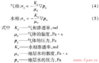 考慮氣水相流動時分別服從達西滲流定律,則有運動方程: