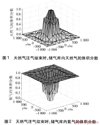 之后開始向儲氣庫注入天然氣,運行到第116天時,累積注入量(10022400m3)約達到目標注氣量,停止注氣。天然氣注入結束時,儲氣庫內(nèi)天然氣及氮氣的體積分數(shù)見圖1、2。由圖1、2可知,隨著天然氣的注入,天然氣逐漸將氮氣向周圍驅(qū)開,因而注采井周圍區(qū)域為純天然氣區(qū);由于氣體擴散,天然氣與氮氣相互摻混,因而從注采井逐漸向外,天然氣的體積分數(shù)逐漸減小,氮氣的體積分數(shù)逐漸增大,形成天然氣與氮氣的混合帶;再逐漸向外,為純氮氣區(qū)。