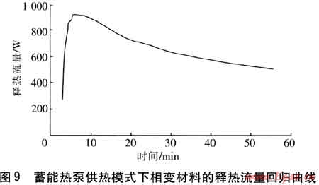 將圖8中的Φc與P相減,得到蓄能熱泵供熱模式下相變材料的釋熱流量,回歸曲線見圖9。由于前2min實驗數(shù)據(jù)不穩(wěn)定且存在Φc<P的情況,因此曲線從第2min給出。與圖7比較,在蓄能熱泵供熱模式運行56min后,制冷系統(tǒng)取走了儲存在相變材料中94.6%的熱量。