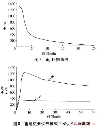 由實驗結(jié)果擬合的蓄能熱泵供熱模式下Φc、P回歸曲線見圖8。與蓄冷模式相比較,由于冷凝溫度的升高,壓縮機的功率增大。Φc的變化趨勢與蓄冷模式類似,但是由于初始溫度高于蓄冷模式,相變材料相應可提取的液態(tài)顯熱量增加。因此,蓄能熱泵供熱模式在達到與蓄冷模式相同的蒸發(fā)壓力水平時,所用時間相應延長。