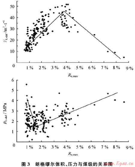 2) 華北地區(qū)石炭 二疊系各煤類朗格繆爾體積與煤級(jí)的關(guān)系呈現(xiàn)出兩段式變化模式,即煤化程度在Ro,max<4%之前,VL,daf隨Ro,max的增加而增大,當(dāng)Ro,max>4%后,VL,daf隨Ro,max的增加而減少;朗格繆爾壓力與煤級(jí)關(guān)系復(fù)雜,數(shù)據(jù)十分離散。