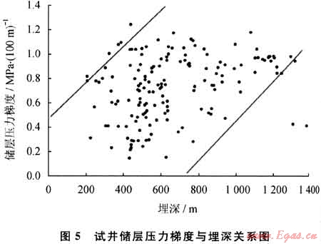 其中,嚴(yán)重欠壓儲(chǔ)層(儲(chǔ)層壓力梯度小于0.5MPa/100m)占21.2%,欠壓儲(chǔ)層(儲(chǔ)層壓力梯度介于0.5~0.75MPa/100m)占29.4%,略欠壓儲(chǔ)層(儲(chǔ)層壓力梯度介于0.75~0.90 MPa/100m)占18.8%,正常壓力儲(chǔ)層(儲(chǔ)層壓力梯度介于0.90~1.10MPa/100m)占27.1%,超壓儲(chǔ)層(儲(chǔ)層壓力梯度大于1.10MPa/100m)占3.5%(圖4)。儲(chǔ)層壓力梯度總體隨埋深的增加呈現(xiàn)出增大的趨勢(shì)(圖5)。