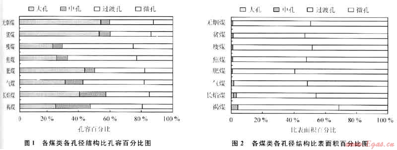 1) 華北地區(qū)褐煤、長(zhǎng)焰煤各孔徑結(jié)構(gòu)中比孔容分布較均勻,其他煤類中大孔、過(guò)渡孔占較高比例,中孔不發(fā)育;各煤類各孔徑結(jié)構(gòu)中比表面積微孔、過(guò)渡孔占絕對(duì)多數(shù)。