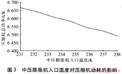 圖3是在固定原料氣壓縮后壓力和制冷劑進(jìn)入冷箱壓力的情況下,原料氣壓縮機(jī)和制冷劑壓縮機(jī)總功率隨著中壓膨脹機(jī)入口溫度的變化曲線。由圖3可見,隨著中壓膨脹機(jī)入口溫度升高,系統(tǒng)總功耗減小。這是因?yàn)殡S著中壓膨脹機(jī)入口溫度升高,1號(hào)換熱器熱負(fù)荷減小,隨之系統(tǒng)總熱負(fù)荷減小,故制冷劑壓縮機(jī)功耗降低。但中壓膨脹機(jī)入口溫度不能過高,否則2號(hào)換熱器將出現(xiàn)負(fù)溫差而不能正常工作。