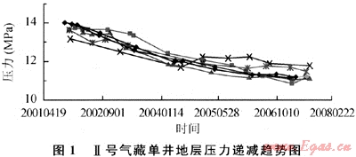 圖2顯示,Ⅱ號(hào)氣藏壓降呈指數(shù)遞減規(guī)律,線性關(guān)系較好,由線性回歸公式Y(jié)=0.004X+15.37,計(jì)算得到該氣藏的動(dòng)態(tài)地質(zhì)儲(chǔ)量為38.4×108m3。