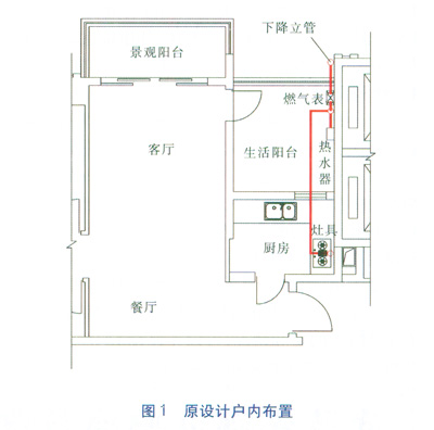 某樓盤所有戶型都是房地產(chǎn)精裝修,一些戶型的廚房位于進(jìn)戶大門旁,廚房的窗口外面是敞開式生活陽臺(tái),客廳和餐廳左側(cè)是兩房間,燃?xì)饬⒐馨惭b在敞開式生活陽臺(tái)外側(cè),燃?xì)獗砗蜔崴饕差A(yù)先安裝在敞開式生活陽臺(tái)上,燃?xì)獗砬叭細(xì)夤艿兰芸辗笤O(shè)在敞開式生活陽臺(tái)的墻上,表后管道采用銅管直埋于墻壁,并沿墻壁下來直接進(jìn)入地板內(nèi)敷設(shè),從而連接熱水器和燃?xì)庠?。這種布置方式是符合規(guī)范要求的。原設(shè)計(jì)戶內(nèi)布置見圖1。