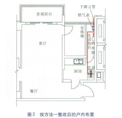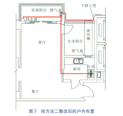 這個(gè)方法的優(yōu)點(diǎn)是先前做好的燃?xì)庠O(shè)施不用重新布置,也基本滿足了用氣條件。其缺點(diǎn)是敞開式生活陽臺(tái)變小了,廚房的窗戶變成門,造成櫥柜變少了,業(yè)主意見不一。