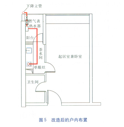 由于業(yè)主強(qiáng)烈要求不僅熱水器要供燃?xì)?,茶水間內(nèi)的單眼灶也需要用燃?xì)?。因此,我們考慮了規(guī)范的要求,茶水間作為廚房用時(shí),在茶水間與起居室兼臥室間增設(shè)實(shí)體墻和門,使茶水間與起居室得到有效隔離,并要求業(yè)主選用帶有自動(dòng)熄火保護(hù)裝置的燃?xì)庠?,這樣就滿足用氣條件。燃?xì)獗砗笕細(xì)夤艿揽梢圆捎勉~管直埋于墻壁,并分兩路,一路在墻壁敷設(shè)引進(jìn)熱水器,另一路沿墻壁下來直接進(jìn)入地板內(nèi)敷設(shè),從而連接單眼灶。這樣熱水器和單眼灶都能使用燃?xì)狻8脑旌蟮膽魞?nèi)布置見圖5。