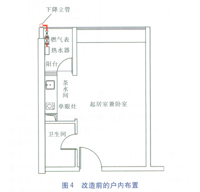 舉例:有一公寓戶型,茶水間作為廚房用,布置有煙道、單眼灶和洗手盆,并與起居室兼臥室相連。由于此戶型衛(wèi)生間是暗室,因此,熱水器只能安裝在陽臺(tái)上,燃?xì)饬⒐馨惭b在陽臺(tái)外側(cè),燃?xì)獗戆惭b在陽臺(tái)上,表前燃?xì)夤艿姥貕芸辗笤O(shè),表后燃?xì)夤艿啦捎勉~管直埋于墻壁,并引至熱水器。GB 50028—2006第10.4.2條規(guī)定,居民生活用氣設(shè)備嚴(yán)禁設(shè)置在臥室內(nèi)。因此,此戶型的茶水間不具備用氣條件,原設(shè)計(jì)時(shí)我們也沒有將燃?xì)夤艿酪氩杷g,而只供熱水器使用燃?xì)?。改造前的戶?nèi)布置見圖4。