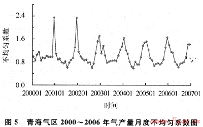 近幾年由于受國家經(jīng)濟宏觀調(diào)控政策和城市環(huán)保要求提高等因素的影響,民用、發(fā)電等用氣增長較快,但民用和采暖用氣的季節(jié)性不均勻問題突出,冬季高月和夏季低月值相差很大。中國石油每年的1、2、3、10、11、12等6個月的不均勻系數(shù)偏大(不均勻系數(shù)為月產(chǎn)量與年均月產(chǎn)量的比值),最高為12月份,連續(xù)6a的12月不均勻系數(shù)都在1.2以上,2005年不均勻系數(shù)達到了1.54的高峰,峰谷差為1.3~1.5倍(圖3)[4~5]