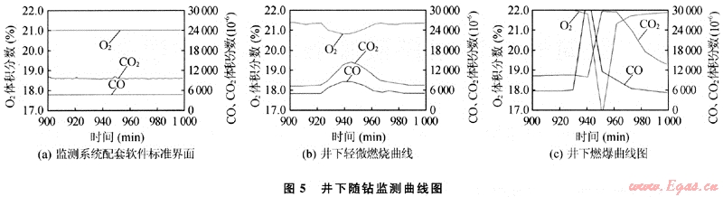 井下隨鉆監(jiān)測(cè)系統(tǒng)是專門為監(jiān)測(cè)井下燃爆現(xiàn)象而開發(fā)研制的。目前,在現(xiàn)場(chǎng)使用比較成熟的是西南石油大學(xué)研制的UBD氣體監(jiān)測(cè)系統(tǒng),其主要原理是在監(jiān)測(cè)到烴類氣體的情況下,通過對(duì)返出氣體中O2、CO2、和CO體積分?jǐn)?shù)變化的監(jiān)測(cè)來判斷井下是否發(fā)生燃爆。一旦發(fā)生井下燃爆,由于井下燃燒為不完全燃燒,返出氣體中的CO2、CO氣體體積分?jǐn)?shù)會(huì)升高,而O2氣體體積分?jǐn)?shù)會(huì)降低。圖5是3種情況下監(jiān)測(cè)界面圖的對(duì)比[2]。