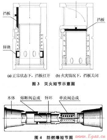 滅火短節(jié)(見圖3、圖4),即鉆柱防火接頭,這是一種低熔點(diǎn)合金制造的閥件,即滅火浮閥,閥內(nèi)裝有一個(gè)鋅環(huán)。在正常情況下,循環(huán)的空氣流動(dòng)壓力使彈簧瓣向下張開,允許空氣循環(huán)通過。一旦環(huán)空著火,溫度上升,當(dāng)超過設(shè)計(jì)溫度時(shí),低熔點(diǎn)合金鋅環(huán)熔化使一個(gè)襯套封住空氣流道,關(guān)閉閥門,停止向井底循環(huán)補(bǔ)充空氣,從而切斷氣源使火熄滅。