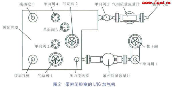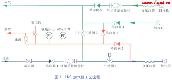 ③LNG加氣機(jī)加氣流程:LNG從加氣機(jī)進(jìn)液管道流向截止閥、單向閥1、液相質(zhì)量流量計、氣動閥1、金屬軟管、加氣槍,然后進(jìn)入車載氣瓶。