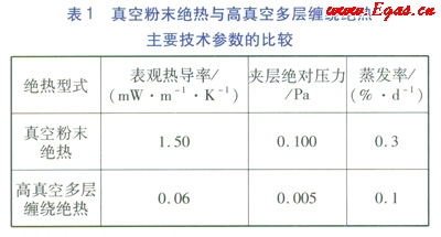 目前,在LNG加氣站的應(yīng)用中,LNG儲罐主要有真空粉末絕熱及高真空多層纏繞絕熱兩大類。真空粉末絕熱在絕熱空間充填多性絕熱材料(珍珠巖粉),對真空度的要求不高。與之相比,高真空多層纏繞絕熱由多層反射材料和隔物交替纏繞而成,夾層抽成高真空,反射材料通常采用鋁箔或鍍鋁滌綸薄膜,隔物一般采用玻璃纖維紙、植物纖維紙或尼龍網(wǎng)。由于高真空多層纏繞絕熱能有效地抑制熱輻射,因此,它具有優(yōu)良的絕熱性能。表1列出了在相同的邊界溫度條件下(300K)兩種絕熱型式的表觀熱導(dǎo)率和夾層真空度的對比,在環(huán)境溫度下兩種絕熱型式的LNG儲罐的蒸發(fā)率的對比。可以看出,高真空多層纏繞絕熱結(jié)構(gòu)的絕熱性能要明顯優(yōu)于真空粉末絕熱。