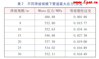 計(jì)算滑坡規(guī)模分別為6m、8m、10m、15m20m、25m30m工況下管道的最大Mises應(yīng)力和最大等效塑性應(yīng)變(見表2),隨著滑坡規(guī)模的不斷擴(kuò)大,管道沿滑坡體滑動(dòng)方向的應(yīng)力、應(yīng)變逐漸增加,當(dāng)滑坡規(guī)模達(dá)到一定程度后,管道的應(yīng)力、應(yīng)變趨于穩(wěn)定并開始降低。該現(xiàn)象可以解釋當(dāng)滑坡規(guī)模較大時(shí),管道的彎曲程度減緩,使得彎曲應(yīng)力降低,一定程度上減小了組合應(yīng)力。