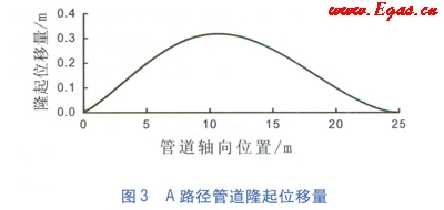 A路徑上各點(diǎn)的垂直方向隆起位移量見圖3(其中A點(diǎn)為坐標(biāo)原點(diǎn),C點(diǎn)位于管道軸向位置25m),可見管道受滑坡體作用發(fā)生隆起,且最大隆起位移位于管道中下部,即B點(diǎn)偏下位置,這是因?yàn)楣艿老路绞艿降耐馏w壓力比上方大引起的。