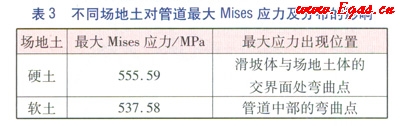 計(jì)算兩種情況下管道的最大應(yīng)力及其位置(見表3),當(dāng)場地土較硬時(shí)最大應(yīng)力出現(xiàn)在滑坡體與場地土體交界處,即在A點(diǎn)和B點(diǎn)的彎曲作用明顯;而當(dāng)場地土較軟時(shí)管道最大Mises應(yīng)力稍小一些,且最大應(yīng)力出現(xiàn)在管道的中部,即較軟的場地土可以使管道產(chǎn)生更大范圍的橫向位移,一定程度上緩解了彎曲應(yīng)力,反而使其最大Mises應(yīng)力有所降低。