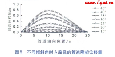 不同滑坡傾斜角時(shí)管道隆起位移量見圖5。管道的隆起位移量隨著傾斜角的增大而增加,但最大隆起位移量始終位于管道中下部,這與管道下方所受土體壓力較大有關(guān)。