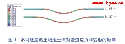 為分析滑坡兩側(cè)場地土體的影響,以滑坡規(guī)模20m為例,其他計(jì)算參數(shù)不變,分別計(jì)算硬土和軟土條件下管道的受力情況,硬土和軟土的剪切強(qiáng)度分別取50kPa35kPa,如圖9所示,當(dāng)場地土體為軟土(9-b)時(shí)管道橫向位移發(fā)生范圍較長。