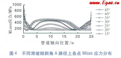 將滑坡規(guī)模固定為25m,滑坡傾斜角分別為15°20°、25°30°、35°40°45°,A路徑上各點(diǎn)的Mises應(yīng)力值見圖4。不同傾斜角下,管道的應(yīng)力集中區(qū)均為管道兩端和中下部。但隨著滑坡傾斜角的增加,管道的三個(gè)應(yīng)力集中區(qū)范圍逐漸增大,特別是管道中段的應(yīng)力集中區(qū)向兩端延伸,且最大應(yīng)力值也隨之增加。