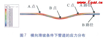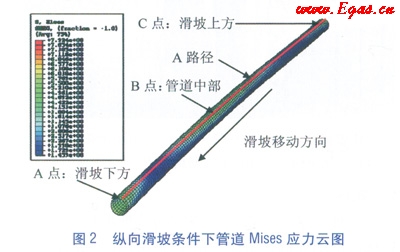 模型中滑坡體取粘土,土體剪切強(qiáng)度為50kPa,滑坡傾斜角為30°,滑坡規(guī)模為25m。以輸油管道為例,管道外徑為711mm,壁厚為10.3mm,管道材質(zhì)為X70鋼,管道內(nèi)壓8MPa,管道埋深1.8m,管的摩擦系數(shù)為0.65。在ABAQUS軟件中繪制出管道的Mises應(yīng)力云圖(見圖2,單位為MPa),并沿管道軸向在管道上取A點(diǎn)、B點(diǎn)、C點(diǎn)和經(jīng)過以上三點(diǎn)的A路徑為參考位置和分析對(duì)象。